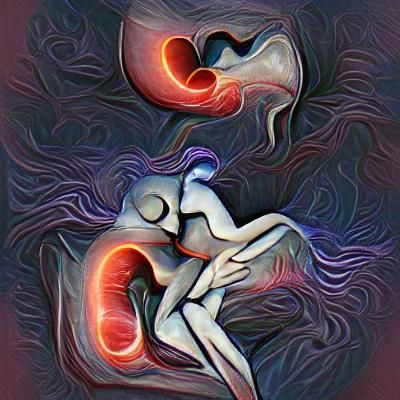 This image depicts two figures intertwined in a loving embrace. The artwork evokes a sense of intimacy and connection through its composition and delicate use of light.