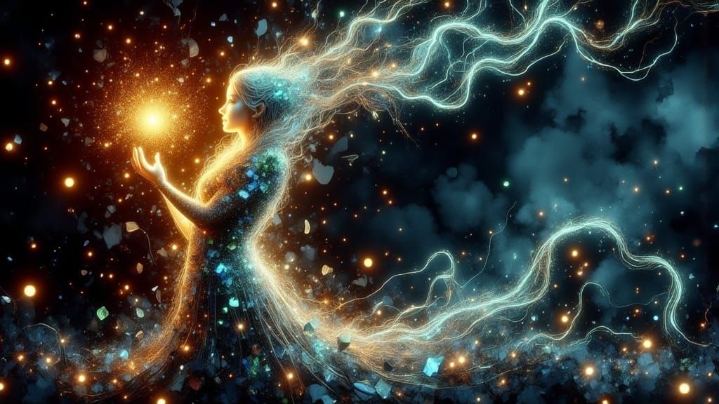 This image depicts an elf queen who appears to be shattering into fragments. The artwork has a watery, digital ink aesthetic with a cracked glass effect.