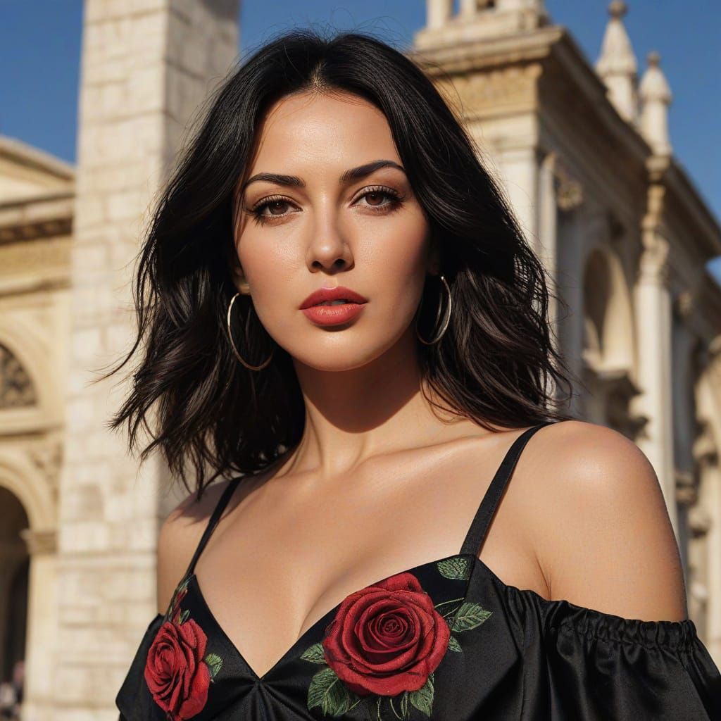 A hyperrealistic portrait of a beautiful Sicilian woman in Piazza Duomo, Siracusa. The woman has long black hair, red lipstick, smokey eyes, and is wearing a black dress with peach roses.