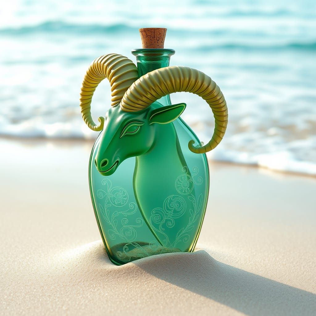This image depicts a stylized Aries zodiac sign, suspended in a transparent green glass bottle, half-buried in turquoise sand, surrounded by gentle waves and evoking the dreamy quality of a René Lalique-inspired glass sculpture.