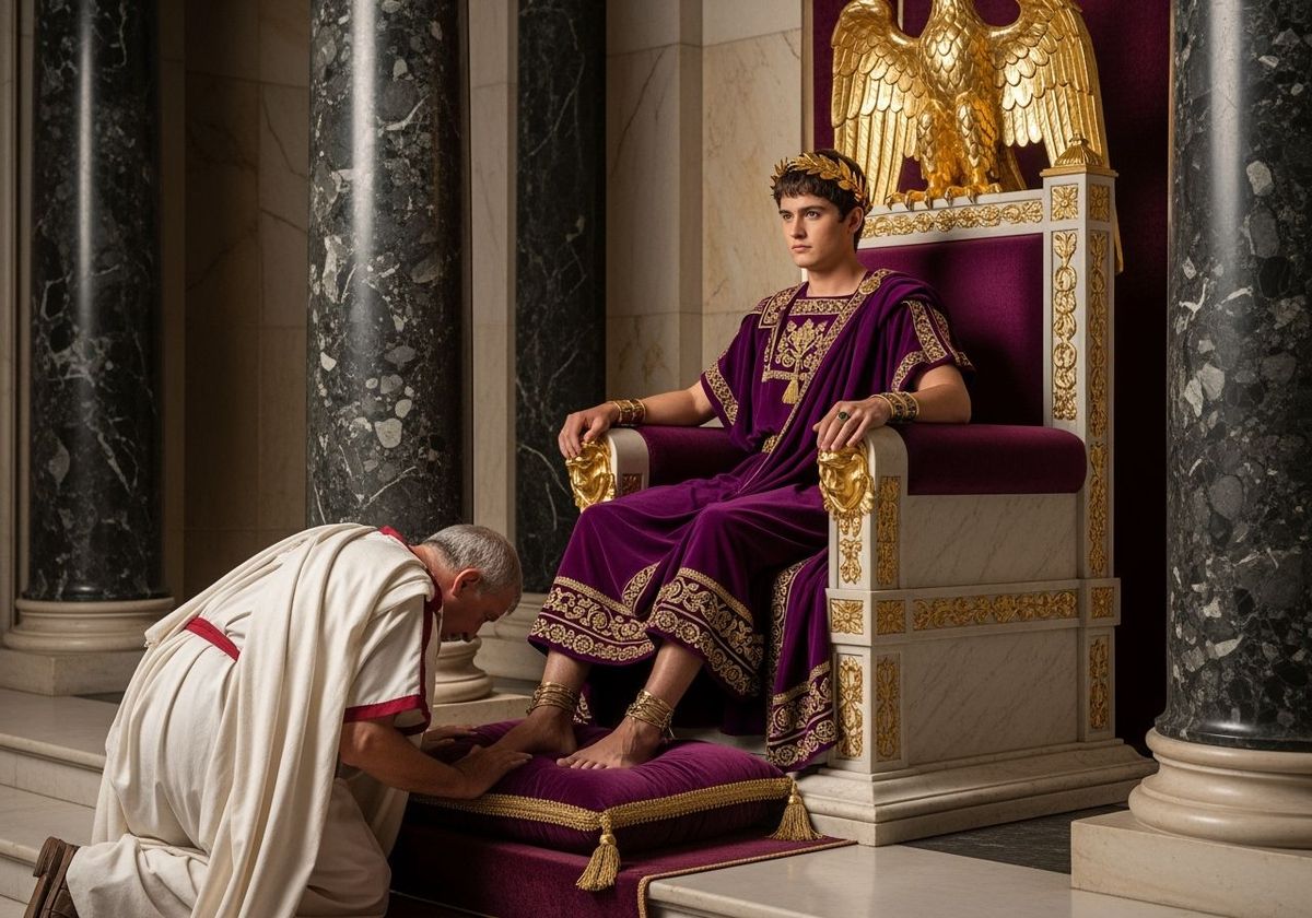 This image depicts a young Emperor Nero seated on an elaborate throne. A Roman senator kneels before him in a lavish throne room with marble columns, captured in a photograph with natural lighting.