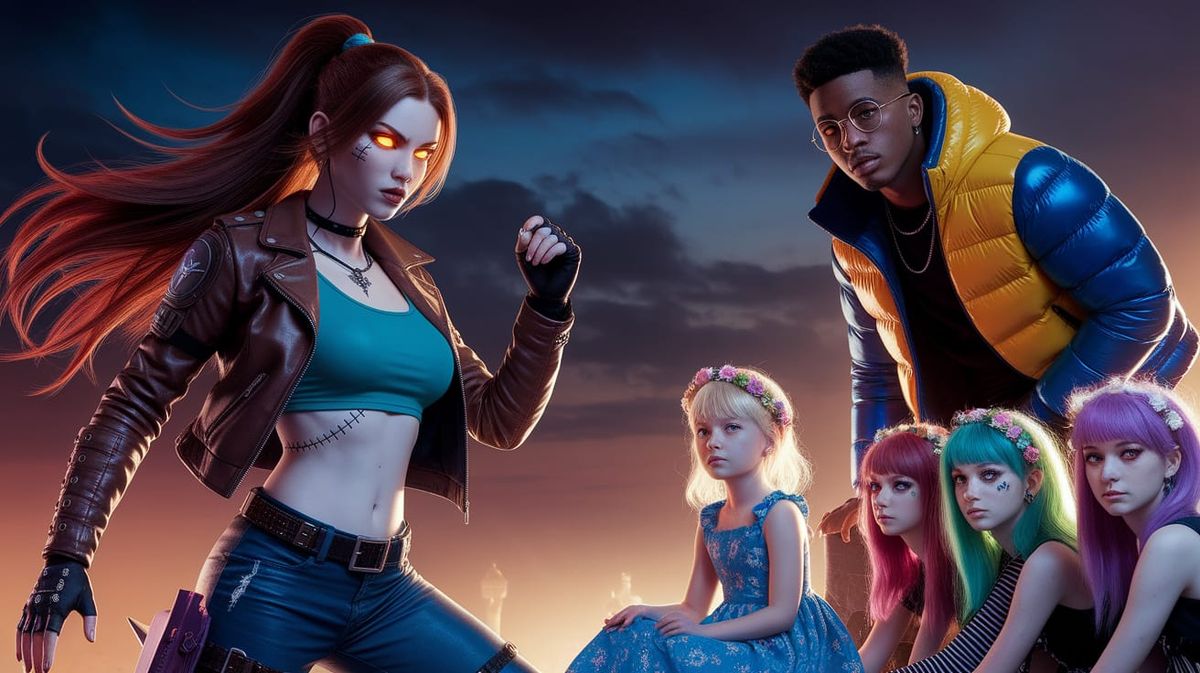 This enchanting image depicts a group of young warriors and friends in a vibrant, mystical atmosphere. A fierce female warrior stands tall, surrounded by a diverse group of alt-punk girls, a young man, and a serene little girl, all set against a moody night sky with warm golden hues.