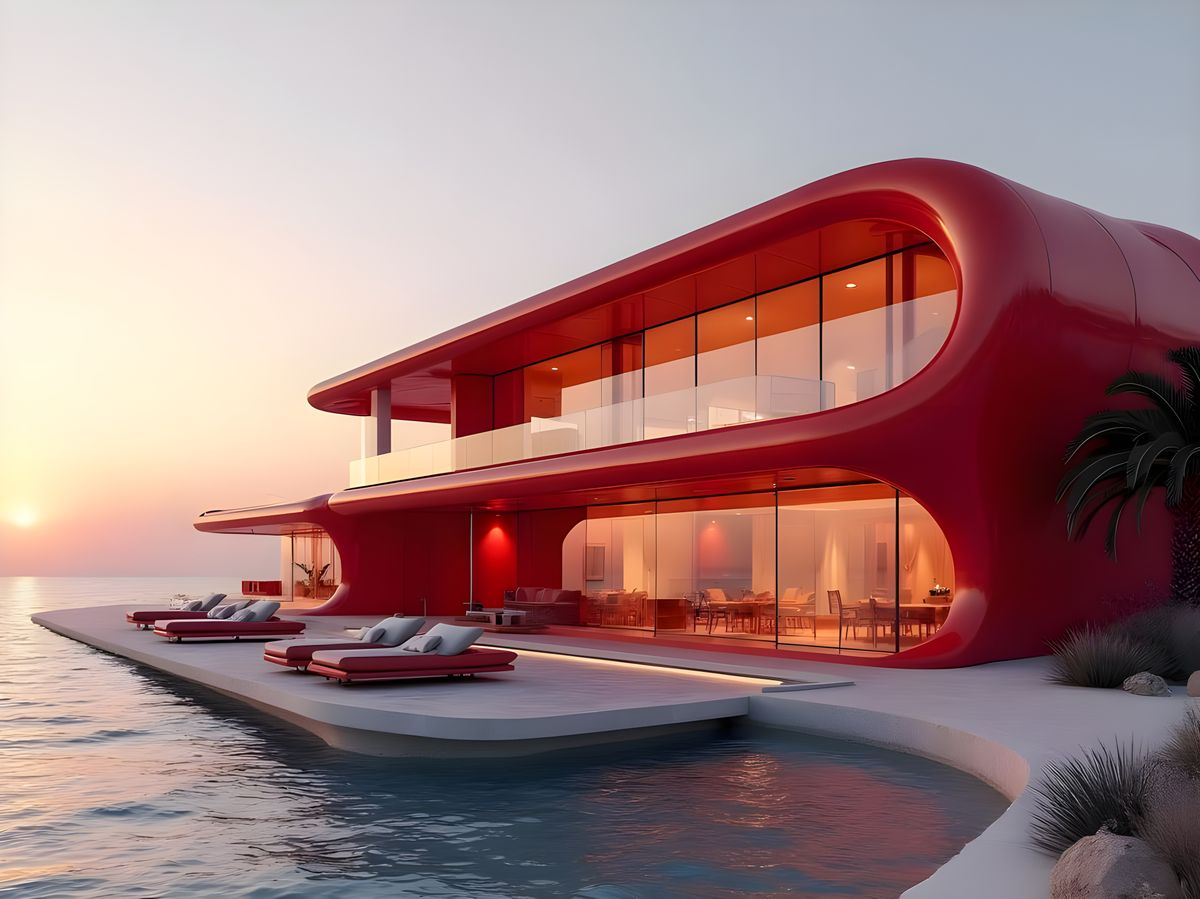 This image depicts a stunning modern mansion with a private beach, exuding luxury and opulence in a vibrant red color scheme.