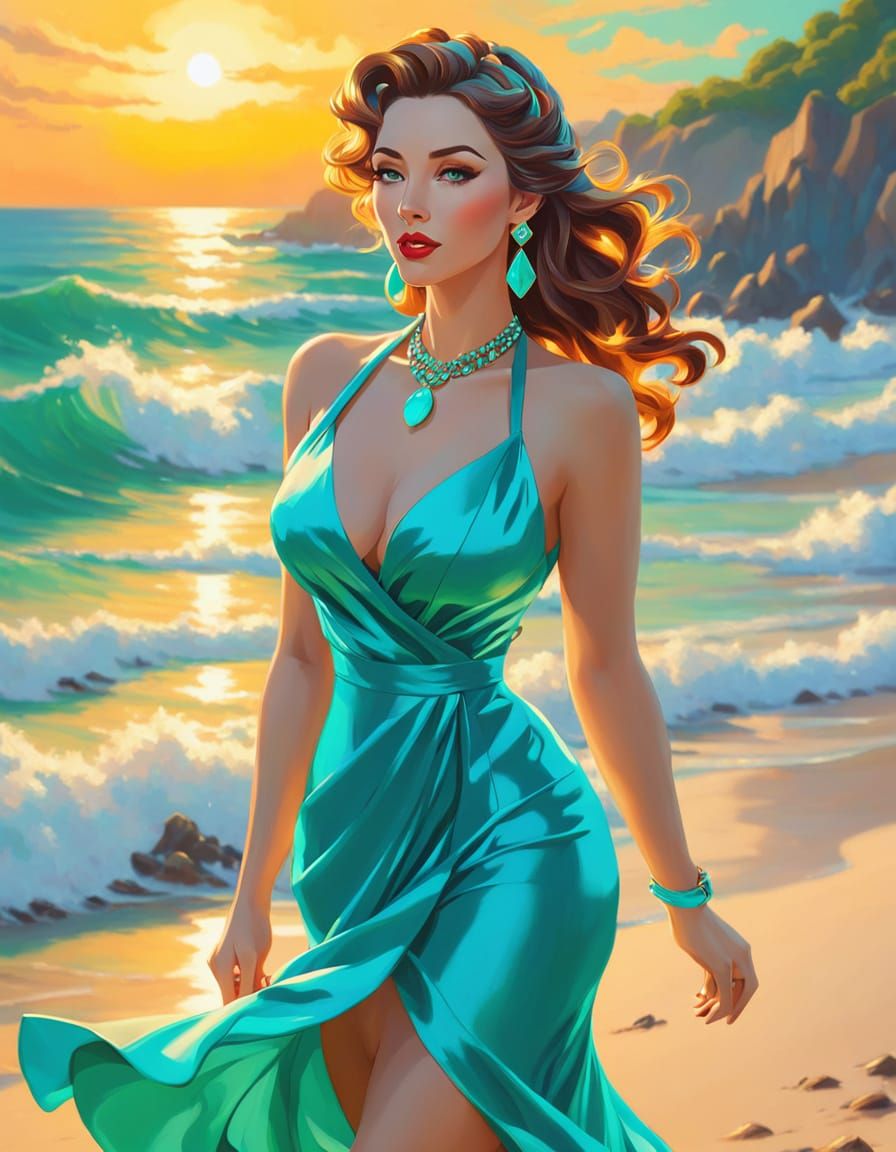 This image shows a young woman in a flowing turquoise dress walking on a beach during golden hour. The vibrant oil painting style highlights her braided hair and shining earrings against soft blue-green waves.
