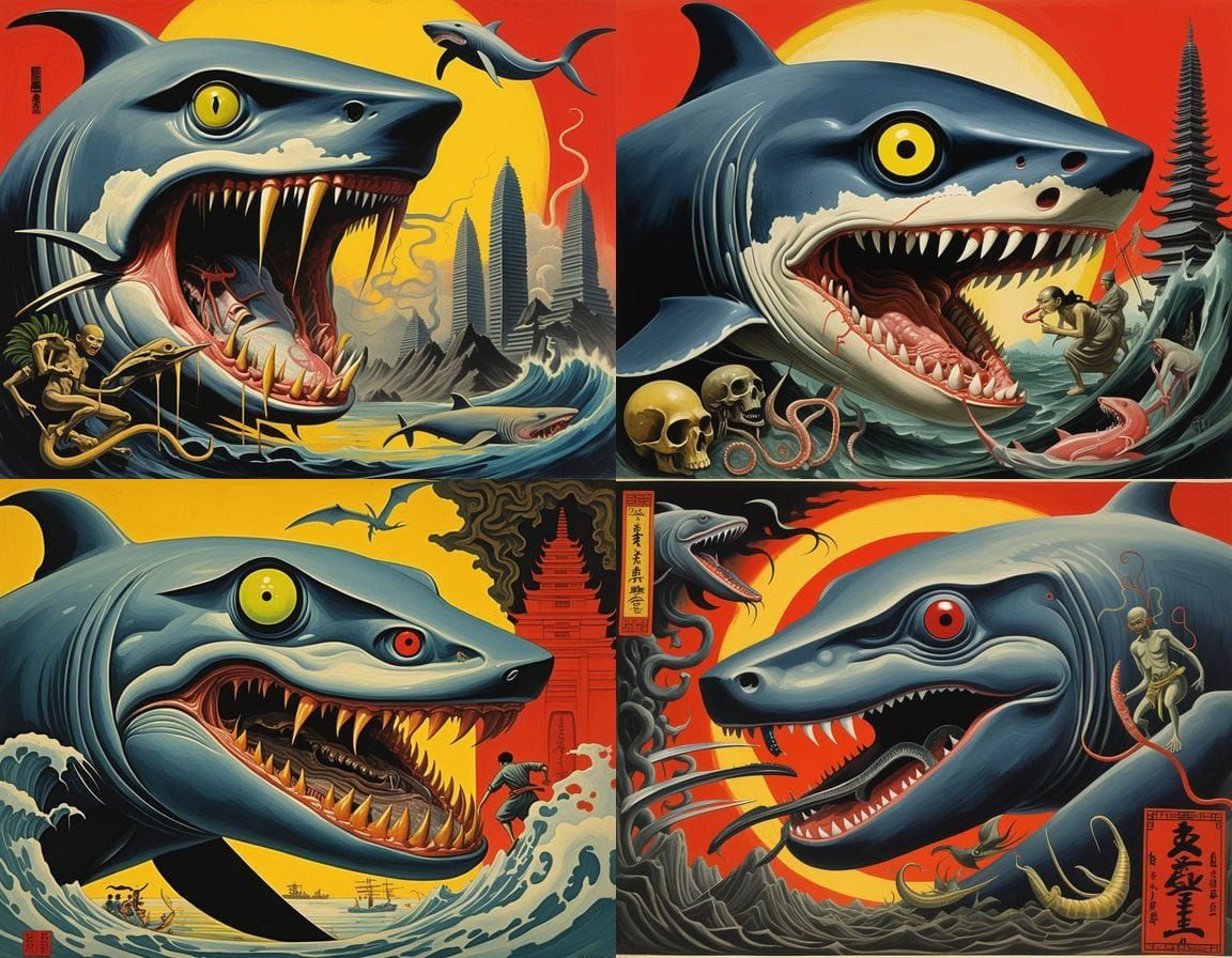 This image depicts a surreal and horrific scene with elements of Asian Art Deco and Japanese art. It features unsettling creatures and a dark, vibrant color palette.