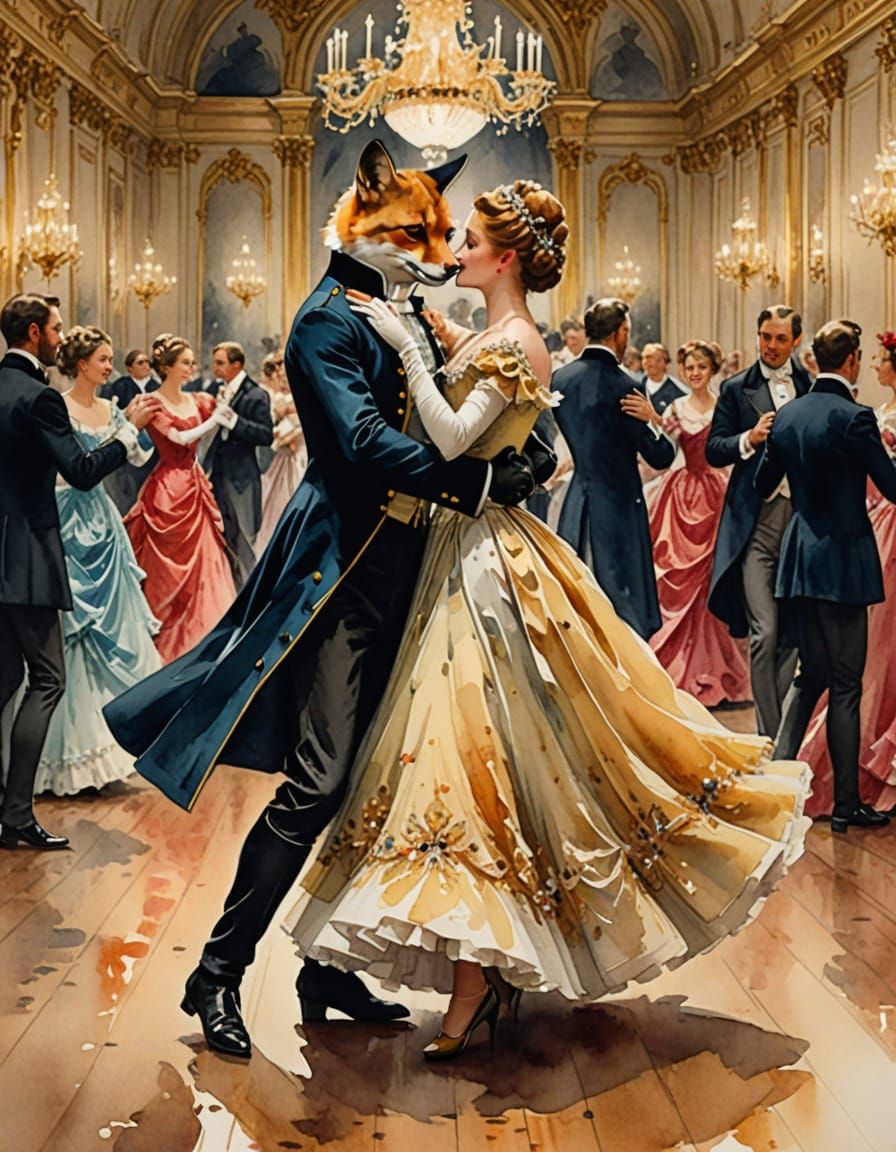 This image depicts two aristocratic foxes waltzing at a grand ball in Vienna. The artwork evokes a romantic watercolor painting, capturing the elegance of the dance.