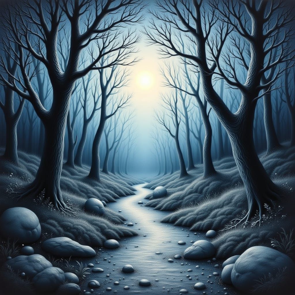 This image depicts a tranquil, moonlit forest scene rendered with tiny, shimmering dots and a soft, dreamy ambiance, evoking an acid etching on glass effect.