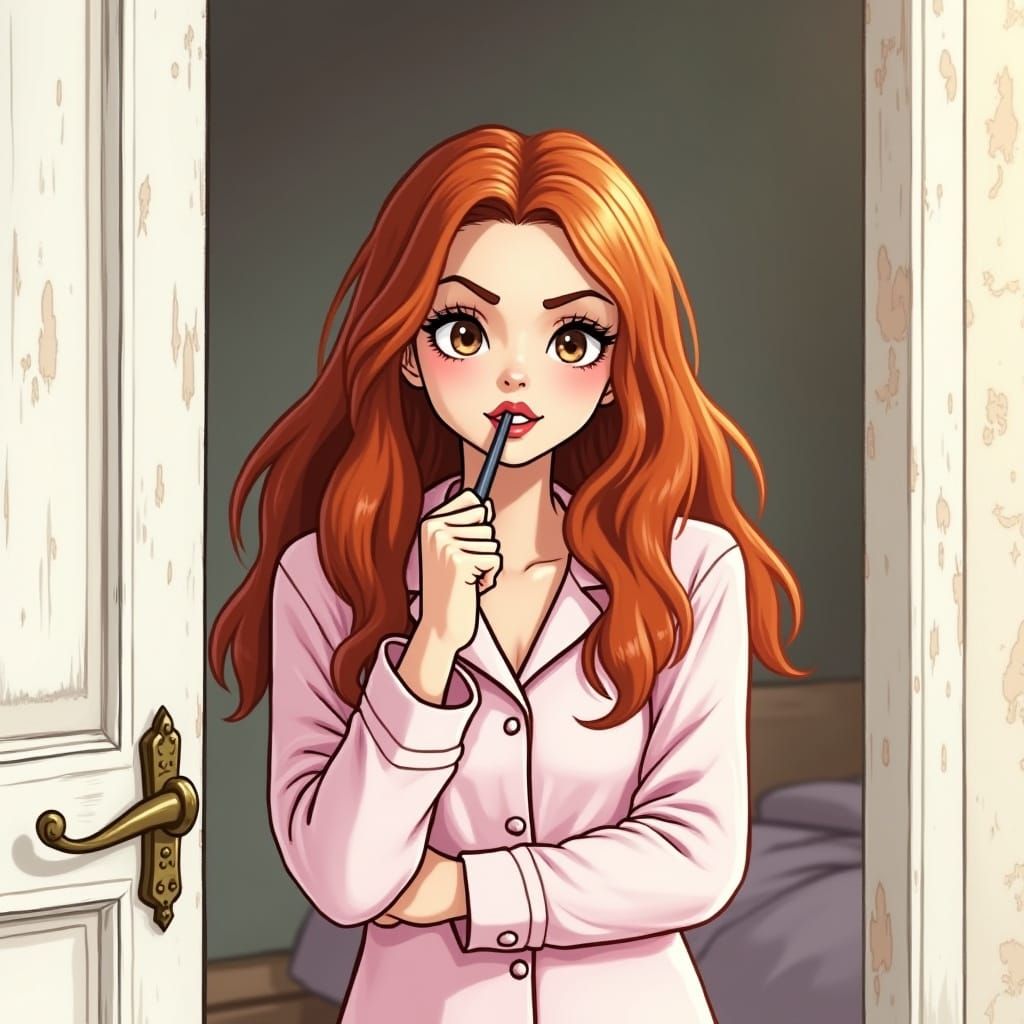 This image shows Ginny Weasley in a warm, intimate moment, clutching a doorway as she gazes into a softly lit bedroom, her face illuminated by golden light, with a playful, mischievous expression, in a realistic style with detailed textures and cinematic lighting.