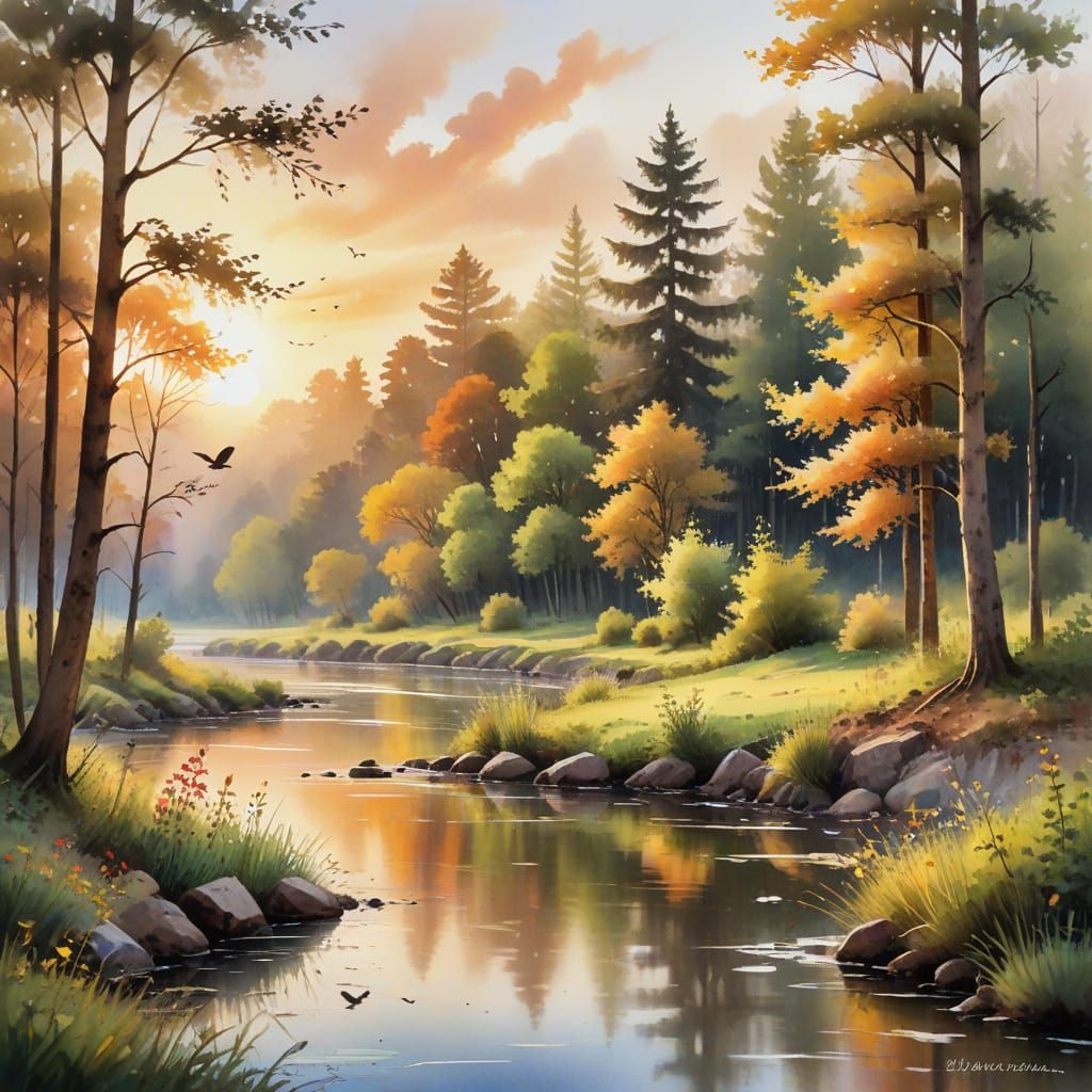 A watercolor landscape showing a forest glade with a river and birds at sunset. The artwork employs soft focus, gentle textures, and a warm, vibrant color palette to create a serene and peaceful scene.