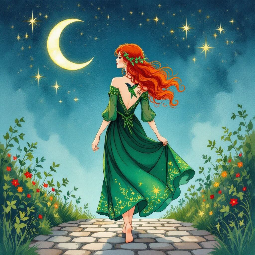 A vintage airbrushed portrait of a bohemian woman with red hair under a crescent moon. She wears an emerald dress with ivy and firefly sequins in this dreamy, ethereal scene.
