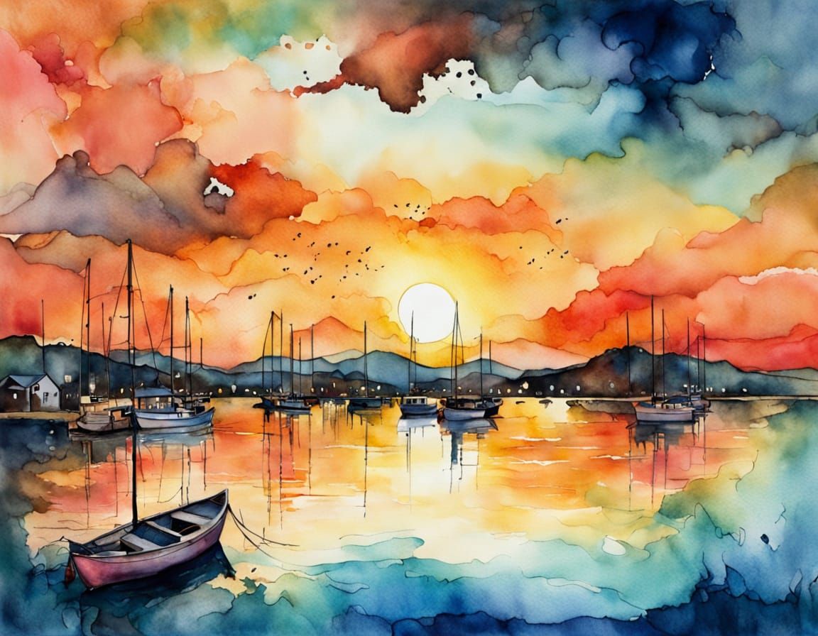 Easily generate beautiful watercolor and alcohol ink sunsets over peaceful harbors with our free AI tool.