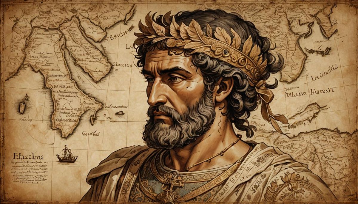 This image shows a mapmaker in his study creating a historically accurate map of the Mediterranean during the 3rd century BC. Crafted in a baroque style with golden hour lighting.