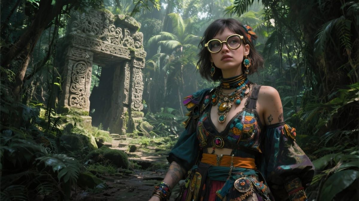 A woman in avant-garde fashion and oversized glasses explores a sun-dappled jungle ruin with ancient carvings. Features cinematic HDR effects and deep shadows.