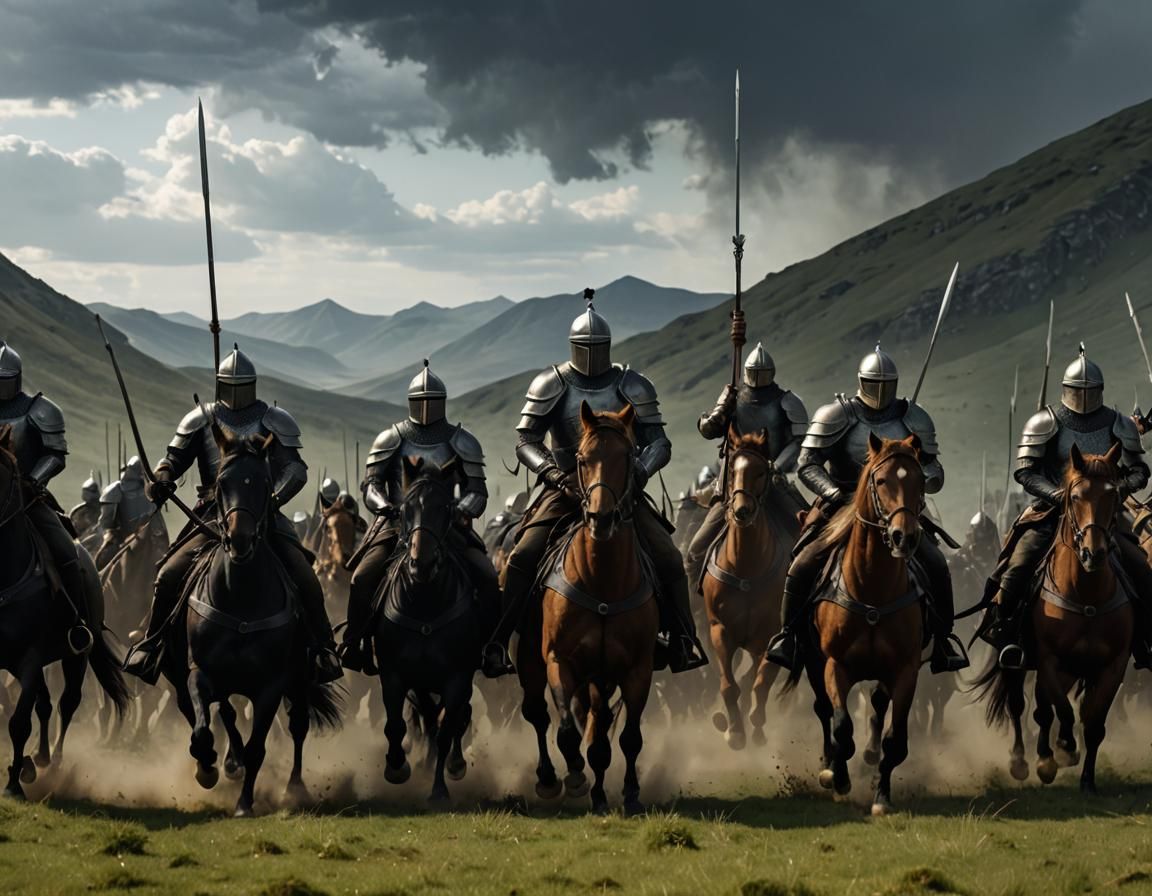 A dramatic image of an army of black-armored knights charging on horseback in a high fantasy setting. The scene is lit with cinematic lighting, creating a moody, atmospheric effect in a digital painting style.