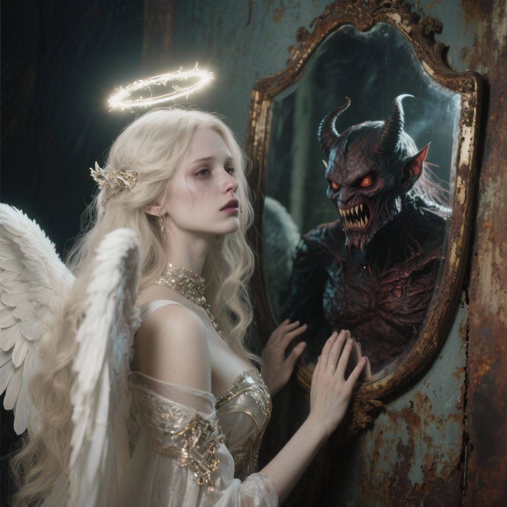This image depicts an angel observing a demonic reflection, rendered with a Lomographic, rusty, and paradoxical aesthetic. It explores themes of inherent magic and transcendence.
