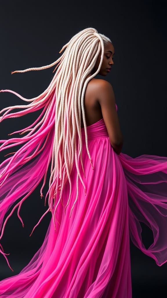 This image depicts a woman with white dreadlocks in a long, flowing dress. The artwork has a cinematic quality, rendered in pink and black with a fluid aesthetic.
