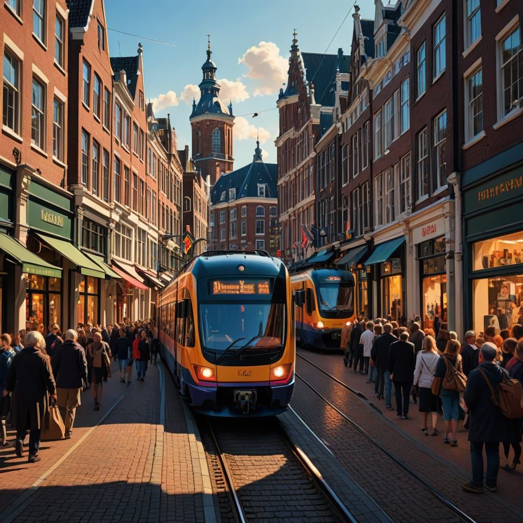 This image shows a double-decker train moving through a crowded, narrow street in Leiden, Netherlands. The vibrant digital art captures the urban landscape in an impressionist style.