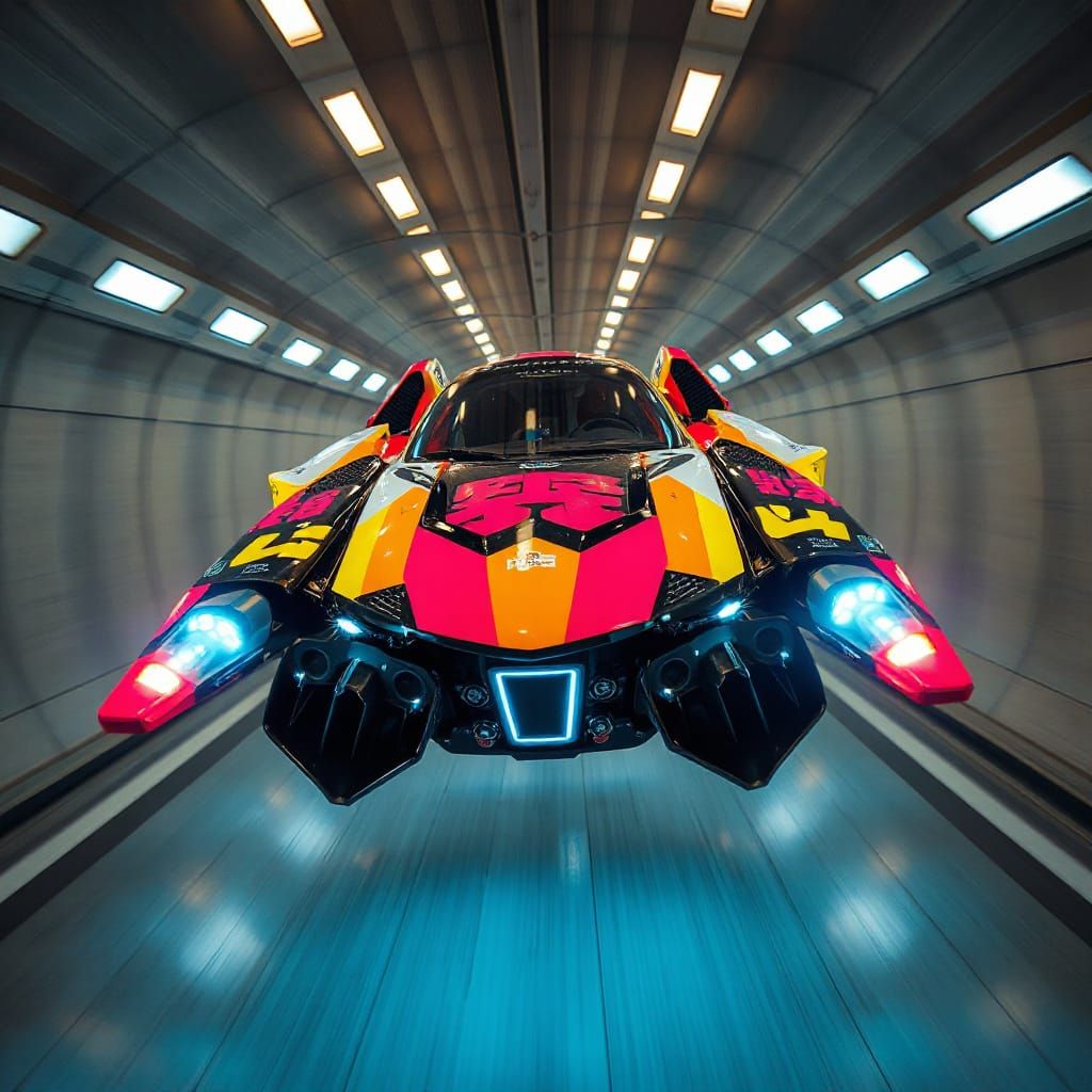 photo photorealistic photographic realism aerial 3D angled photo of a far future flying floating soaring cyber tech sport hover-speeder with huge sporty future logos with chunky Japanese lettering with rounded edges. aerodynamicly designed plastic multicolour and black colour block sections with forward ...