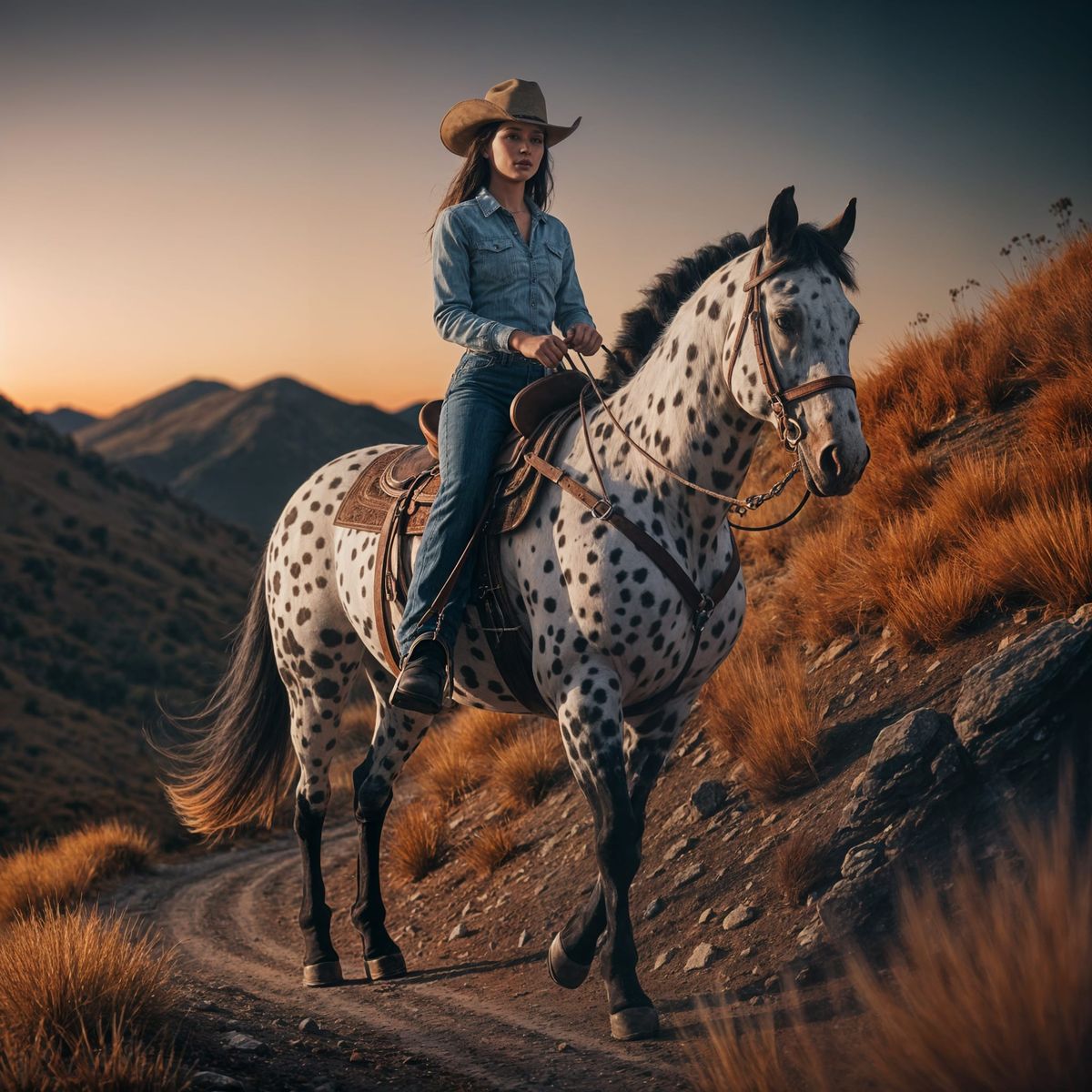 This image captures a young woman riding an Appaloosa along a rugged mountain trail at twilight, with intricate details and a beautifully shot, high-definition view of the rolling hills and distant peaks.