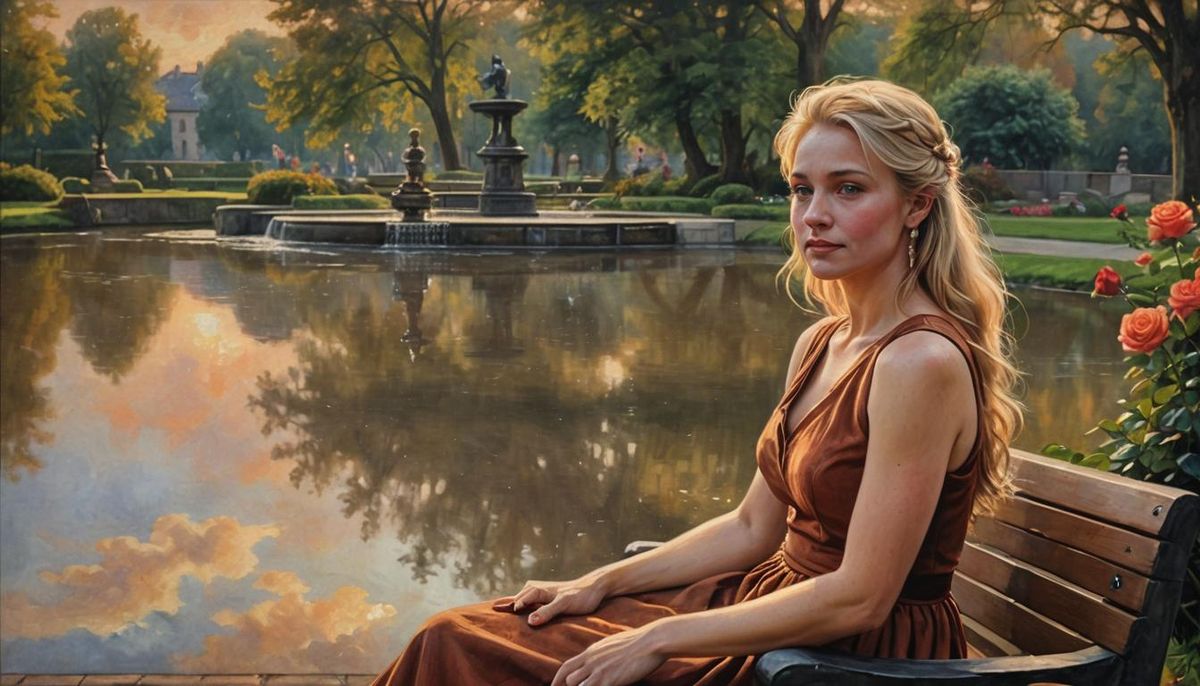 A stunning close-up oil painting of a blonde woman in a park at sunset. Rendered with Renaissance-era chiaroscuro techniques, the portrait captures intricate details and warm colors in a hyperrealistic style.