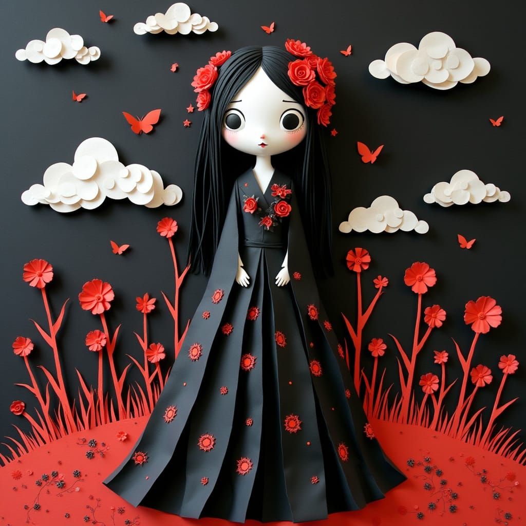 This image shows a woman in a paper mache dress in a paper-cut cemetery, surrounded by origami skeletons, with a black sky and red accents. The image is in a surrealist style.