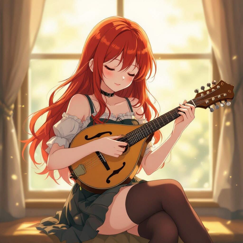This image shows an anime girl with red hair and freckles playing a mandolin, bathed in soft golden light. The artwork features a painterly anime style with detailed textures and a warm color palette.