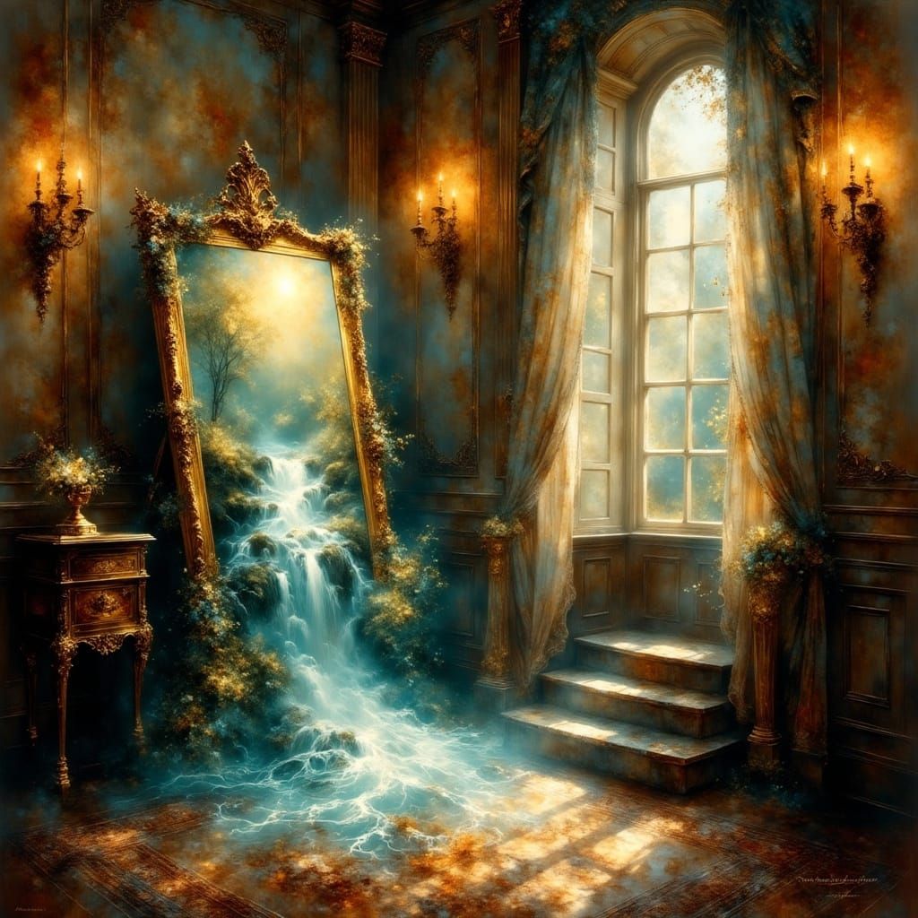 Painting Comes Alive: River Water Spills Onto Ornate Room