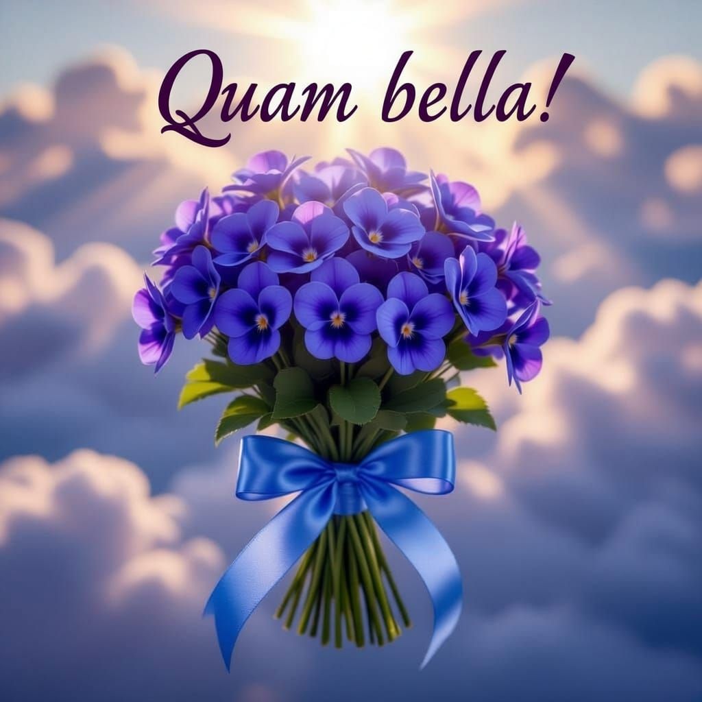 a bunch of violets tied together with a blue ribbon heavenly sunshine beams divine bright soft focus holy in the clouds