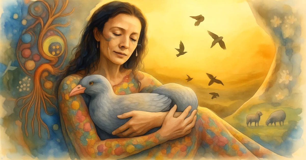 A woman sits contentedly within a massive, abstract sculpture, a bio-art collage inspired by Ayahuasca visions and intricate botanicals. The piece features vivid colors and mosaic patterns.