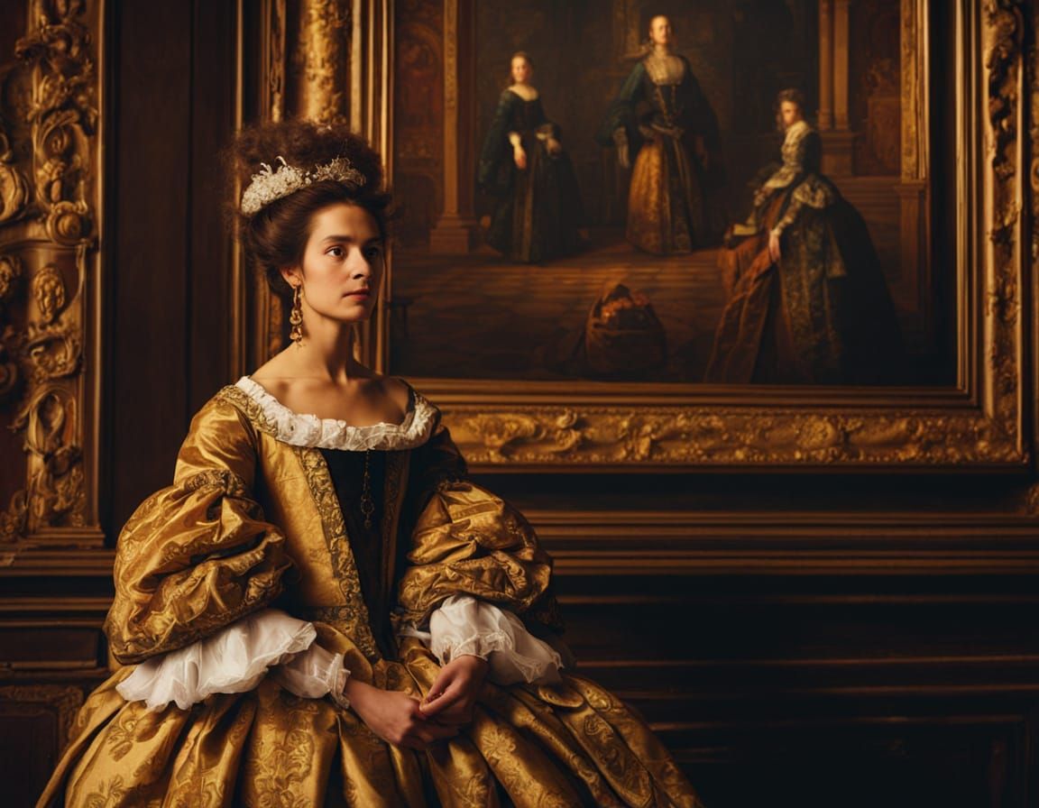 This image shows a woman in a 17th-century dress observing portraits in a baroque castle gallery. The scene is depicted with soft focus, warm golden lighting, and rich wood tones, reminiscent of classical realism.