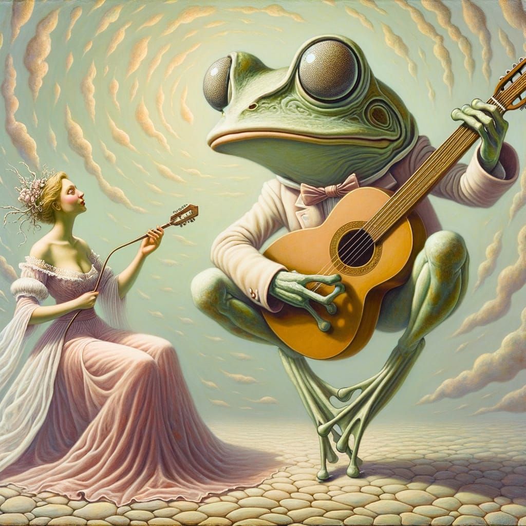 A whimsical painting of an enamored frog serenading a beautiful woman. The surreal scene blends soft textures and subtle shading to create a dreamlike visual experience with delicate highlights.