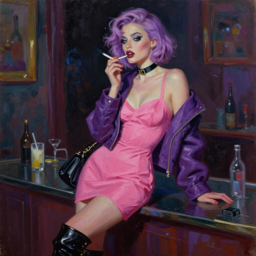 A woman with wavy purple hair and bold makeup leans against a dark bar counter. She is dressed in a pink slip dress, a purple leather-style jacket, and a black choker, holding a lit cigarette to her lips. The scene is cluttered with bottles and glasses, suggesting a late-night bar setting. The lighting is low and theatrical, with deep shadows and highlights that emphasize the textures of her clothing and the surrounding environment, creating a sense of weary glamour or nighttime introspection.
