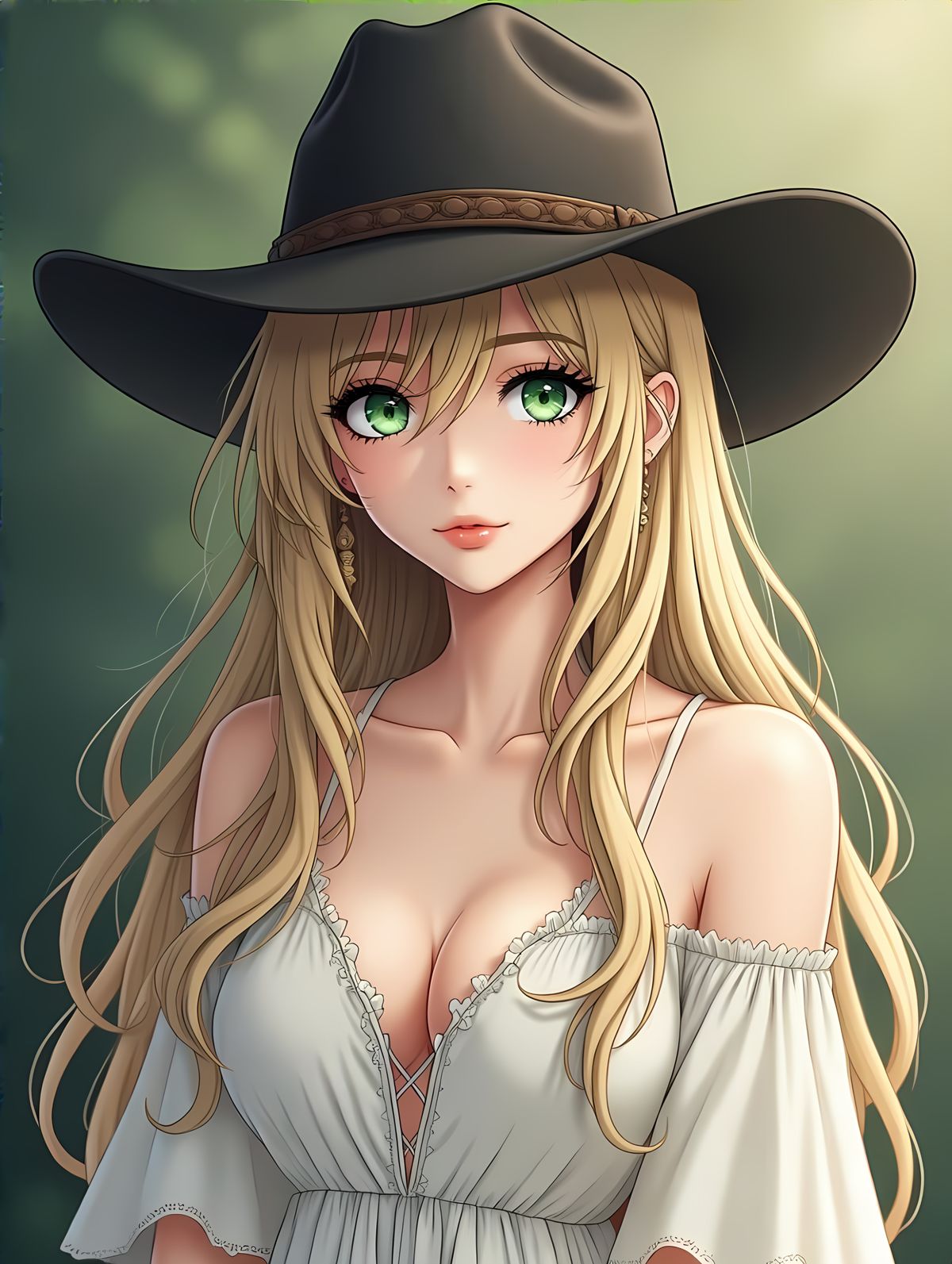 This image captures a serene moment of a beautiful woman with long blonde hair and striking green eyes, dressed in a flowing white bohemian-style dress and a stylish black cowboy hat, in the soft and expressive style of Kyoto Animation.