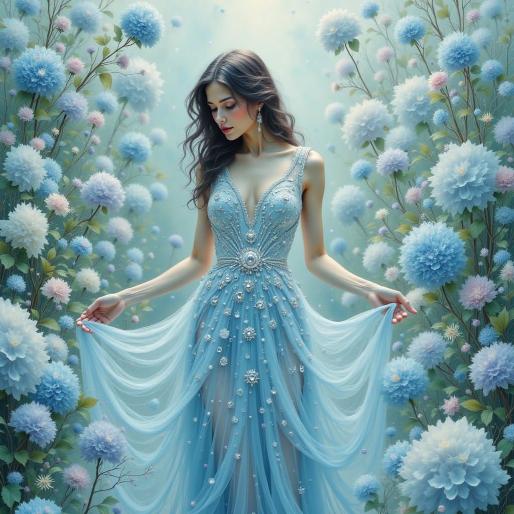 Full length Tim Walker style photo shoot, beautiful woman in a sparkling long dress cyan frosty winter style adorned with crystals and rhinestones standing amongst hydrangea flowers. The dress sparkles in the light, creating an elegant and luxurious image. The background is filled with soft pastel shades ...