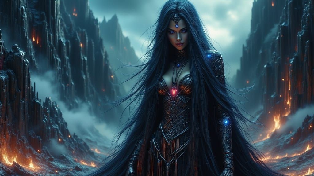 A striking picture of a dark sorceress in mystical robes, her skin covered in glowing runes. The image evokes a dark, mystical realism with eerie energy.
