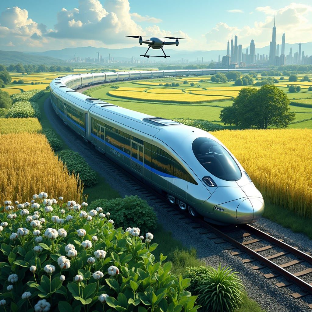 This image shows a futuristic journal cover for agricultural research in 2035. A sleek, seed-shaped train travels past diverse crops and smart technology, symbolizing innovation in agriculture.