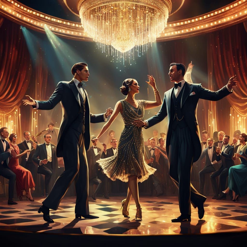 This image shows a lively cabaret scene with men in suits and women in flapper dresses dancing on stage. The artwork features warm lighting, rich textures and a splash art style.