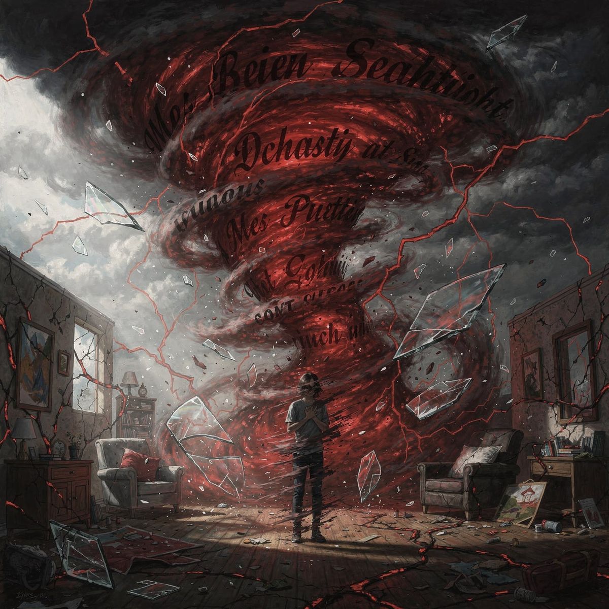 This image depicts a turbulent, chaotic storm rendered in shades of crimson, symbolizing the overwhelming nature of emotional abuse. The art style is abstract and expressive.