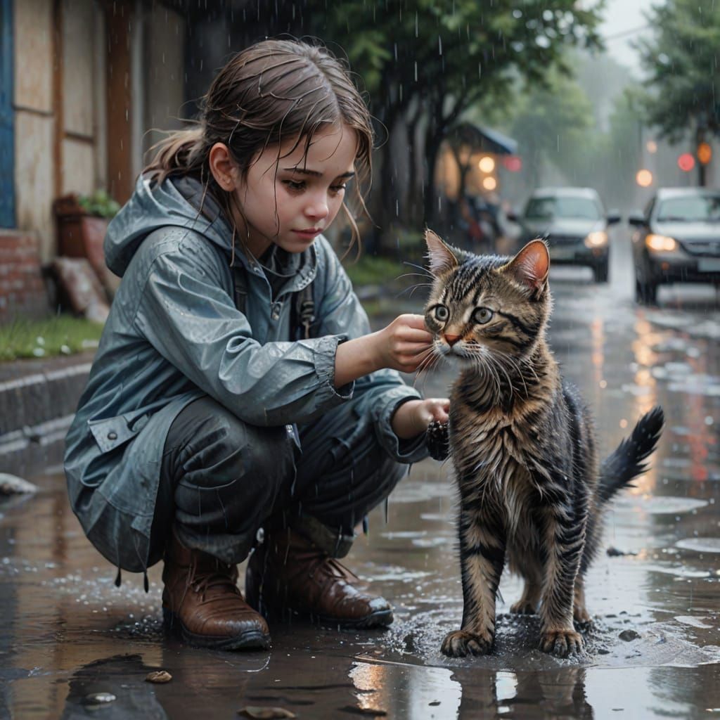 A girl takes a wet kitten from a puddle