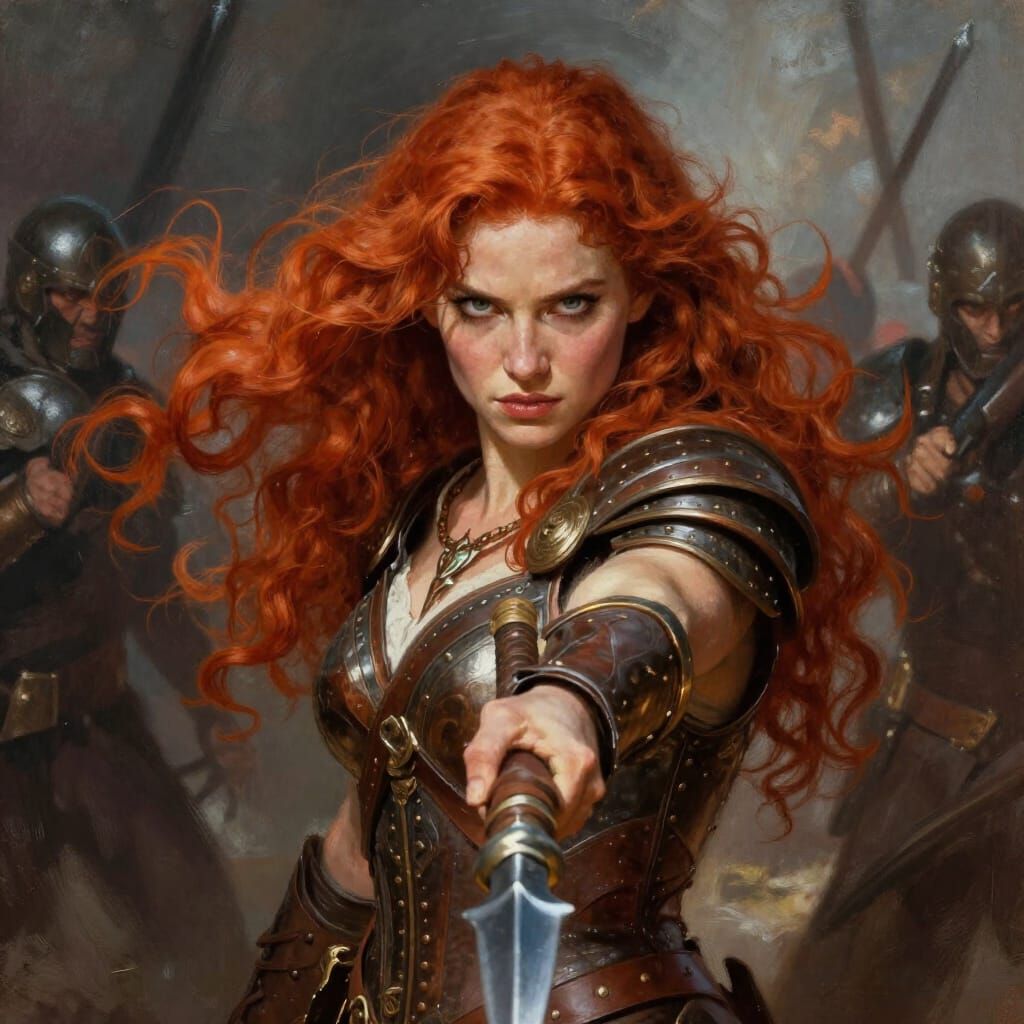 This image features a beautiful redhead warrior woman in detailed armor, holding a spear defensively. The artwork is rendered in a dramatic matte painting style with cinematic lighting, evoking an epic fantasy atmosphere.