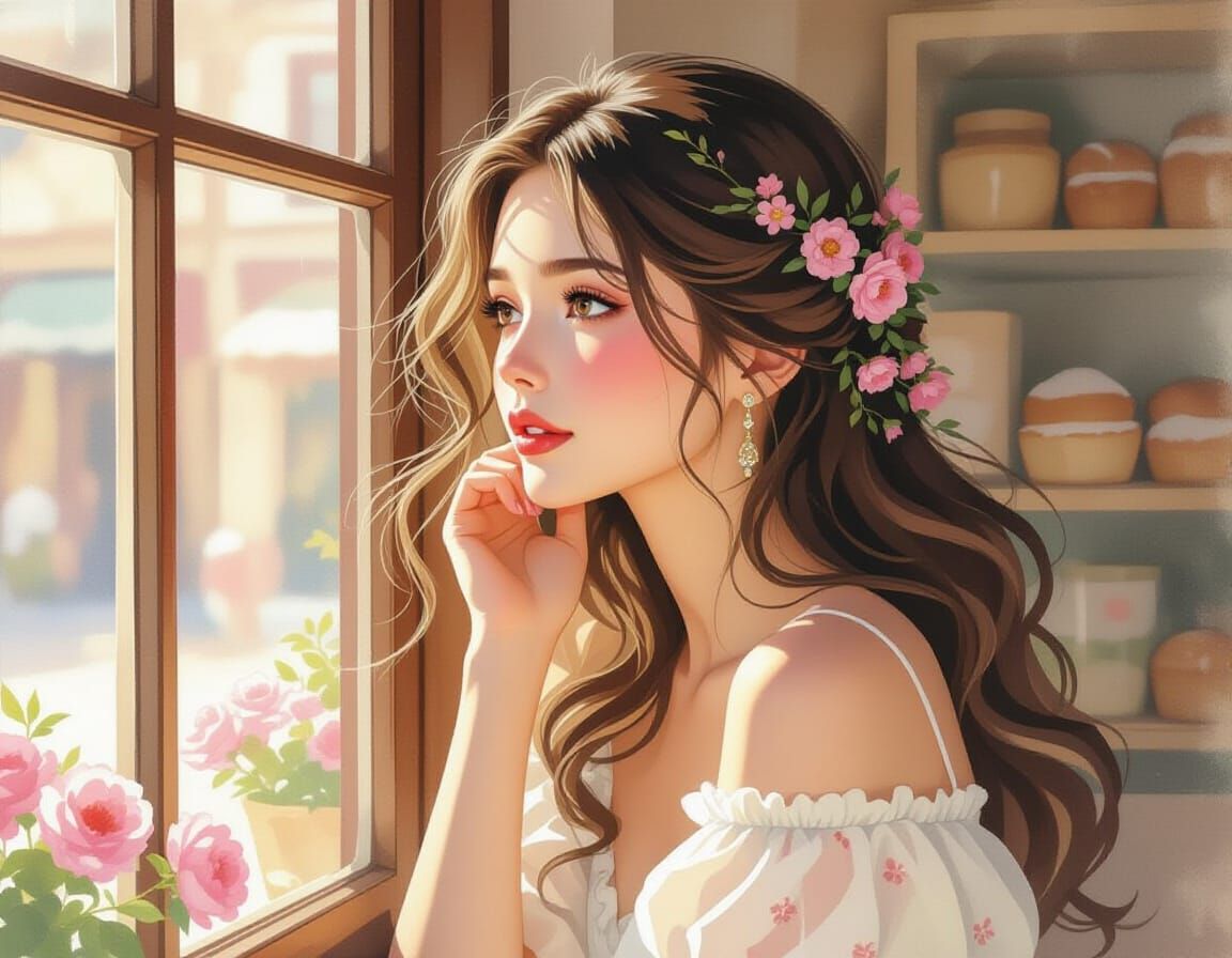 This image shows a woman with flowers in her hair looking out a vintage bakery window. The feminine portrait features a watercolor aesthetic and Art Nouveau influences, capturing a moment of nostalgic charm.