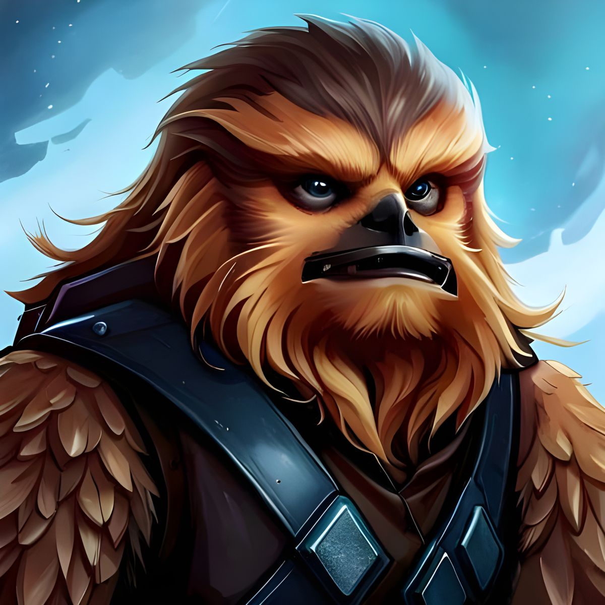 A detailed close-up of Chewbacca costumed as a hawk, beak raised. This highly detailed image evokes digital artwork from CGSociety, with ultra-quality rendering.