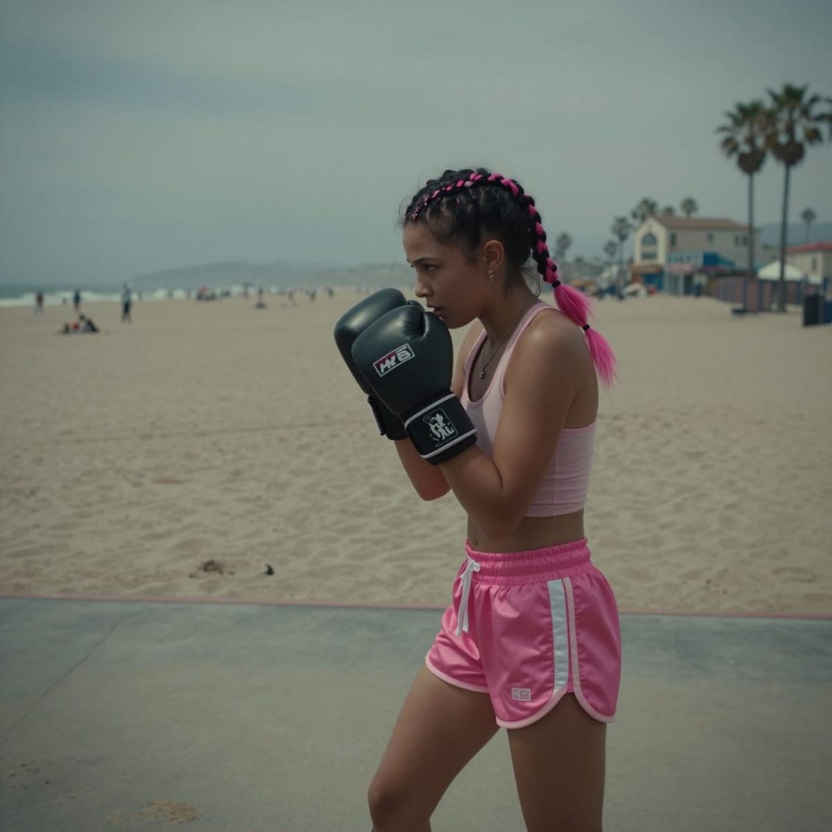 Cinematic film still of a young punk girl with braided black and pink hair training in a boxing class on Venice Beach. Shot with dramatic lighting and film grain for an atmospheric masterpiece.