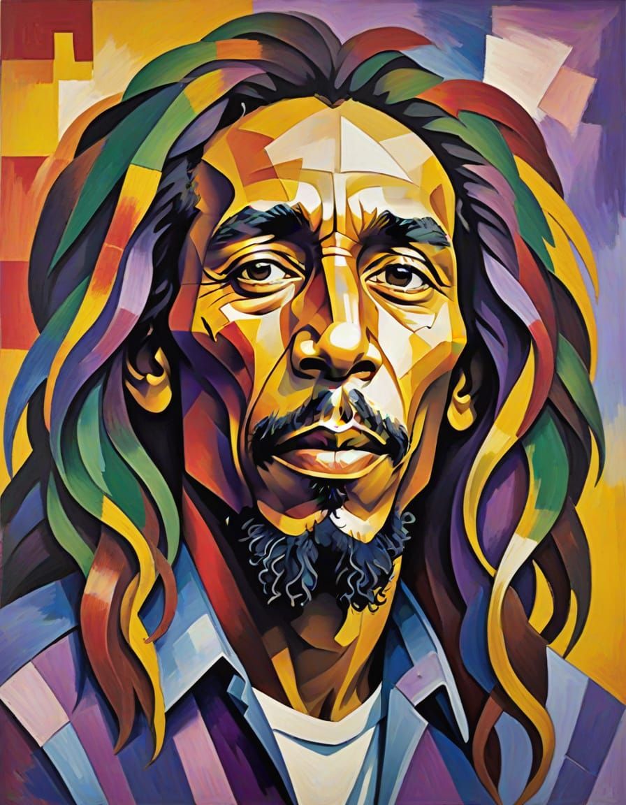 This image shows a Cubist portrait of a reggae legend, painted in a Cézanne-inspired style with rich purple and gold hues.