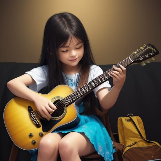 A cinematic film still of a young girl intently playing a vibrant guitar, her eyes sparkling with joy. Rendered in a detailed oil painting style with warm, golden hour lighting.