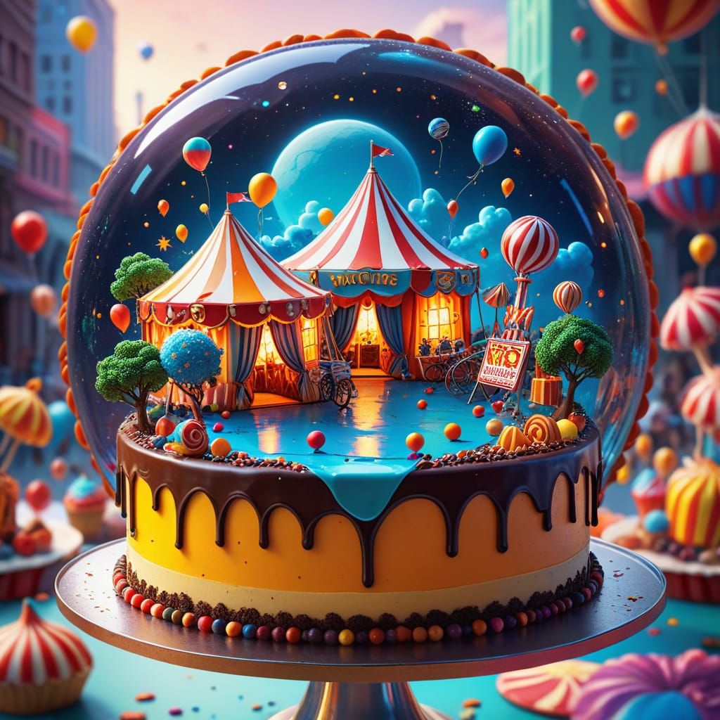 A vibrant and whimsical image of a circus-themed city made of cake. This digital illustration features dynamic lighting, cel-shaded elements, and ray tracing reflections in a postmodern style.