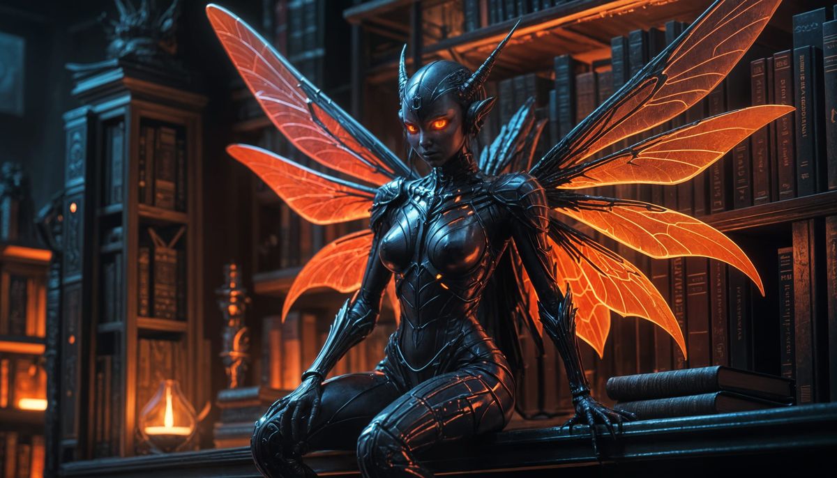 This image shows a tiny, demonic fairy with fiery wings perched in a wizard's library. The scene is rendered in a gritty, cell-shaded style, with high-tech details and a dark, gothic fantasy aesthetic.