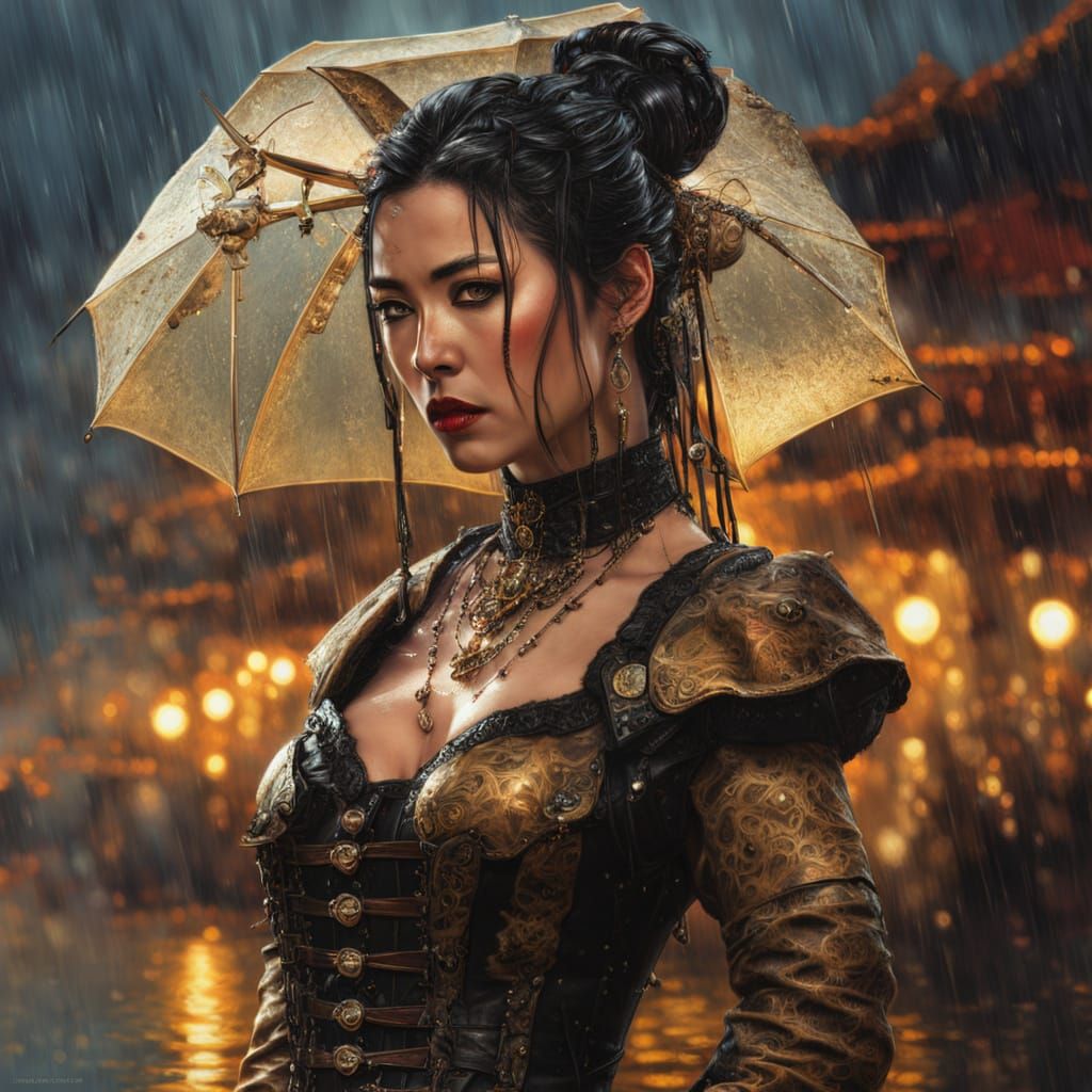 This image shows a captivating steampunk portrait of a geisha in a corset and lace, set against a moody desert thunderstorm backdrop with warm golden lighting and intricate details.