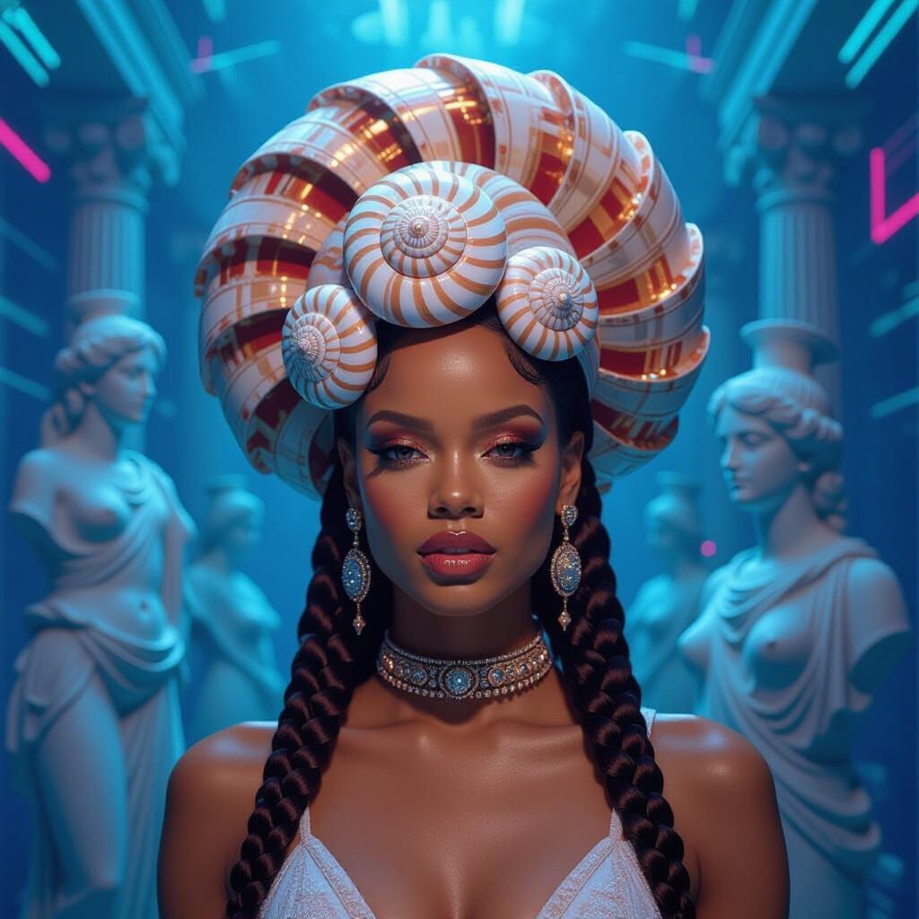 A digital painting showing a woman with a nautilus shell headpiece. Classical sculptures surround her, set against a neon cyberpunk backdrop with digital art elements. The art is rendered in a psychedelic style.