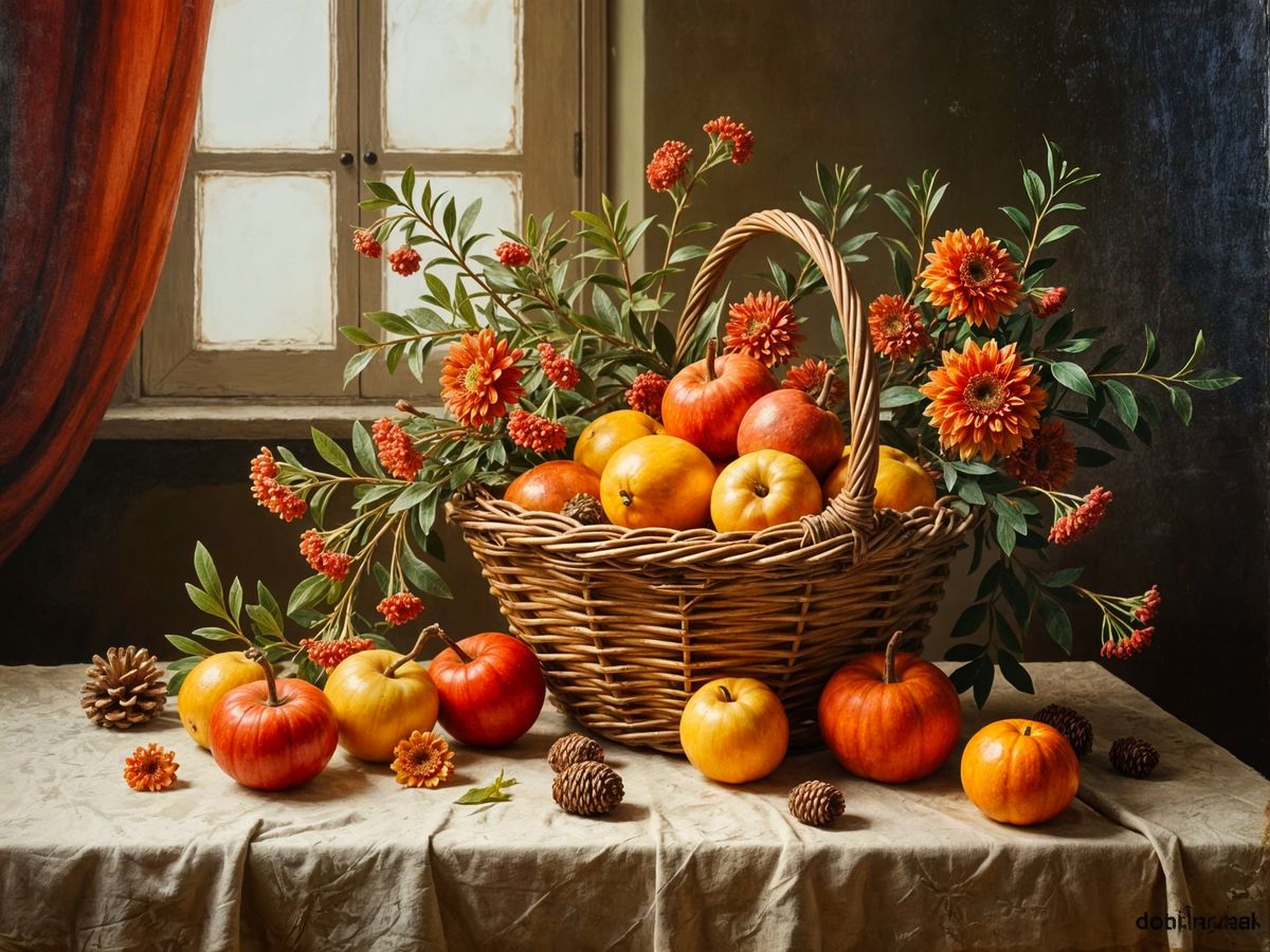 This image showcases a classic oil painting of an autumn still life. It features fruits and flowers in a basket on a textured tablecloth, with a window and decorative elements in the background.